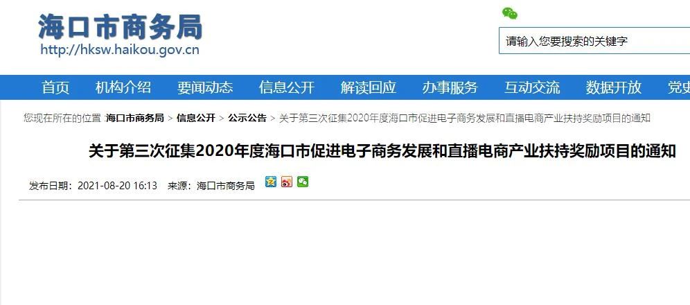 8月20日海口市商務局印發(fā)通知,面向社會公開征集:2020年度??谑写龠M電子商務發(fā)展扶持項目、2020年度??谑兄С职l(fā)展直播電商產業(yè)扶持獎勵項目。符合條件的相關企業(yè)及機構、個人按照有關要求申報。